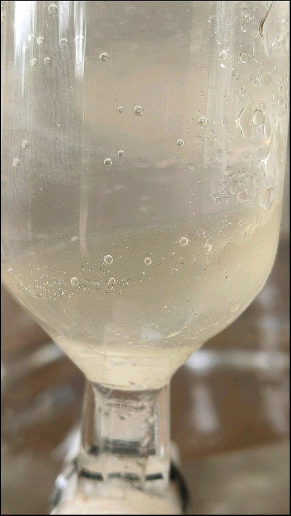 A captivating transformation began to unfold within my reactor bottle. As time gracefully passed, a change in color took place, turning the once clear liquid into a mesmerizing hue of radiant orange, gradually deepening into a rich, velvety brown. With each precious drop of clove oil distilled with utmost care, the essence of these mystical buds gathered in my oil separator.