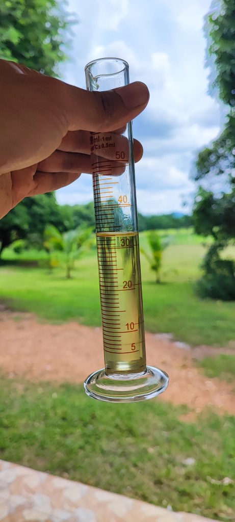 Leaf oil is distilled from dried leaves and stems using traditional wooden stills or steam distillation.